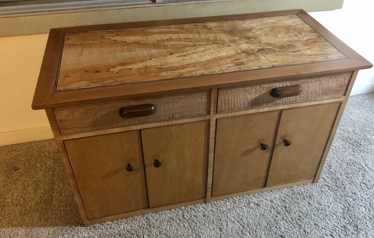 Cabinet. Cherry, ebony, spalted big-leaf maple with rosewood handles and knobs.