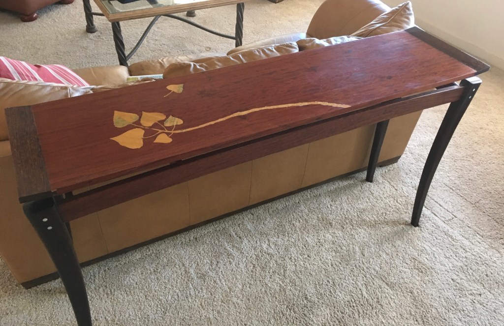 Hall table. Waterfall Bubinga, wenge, yellowheart, birdseye maple, mother-of-pearl inlay.