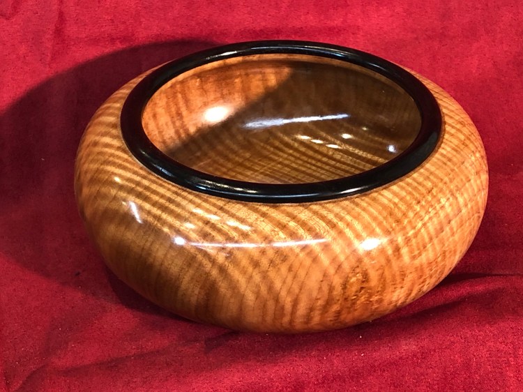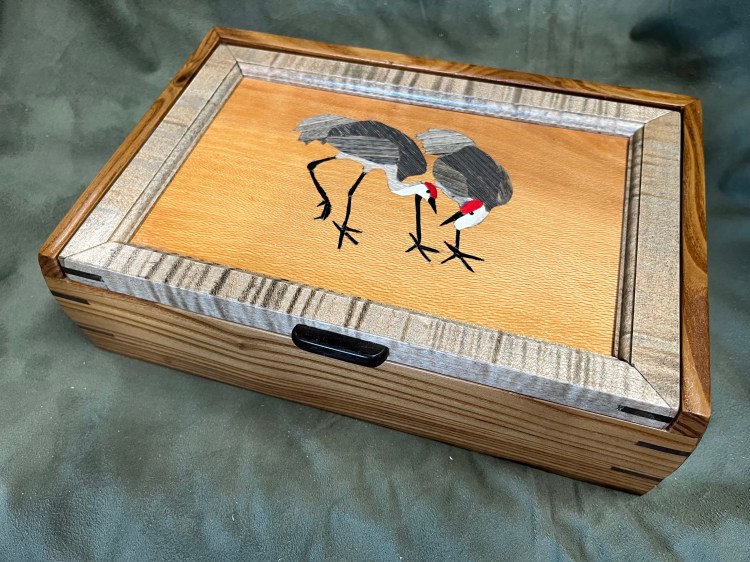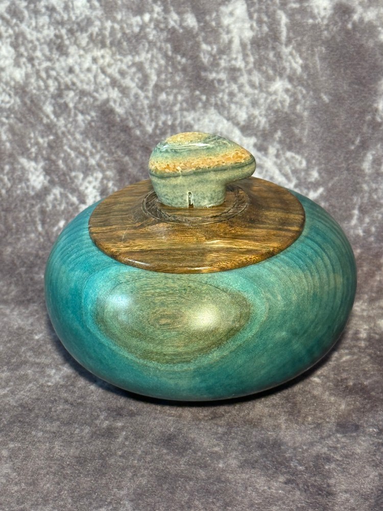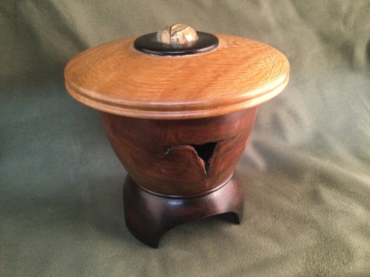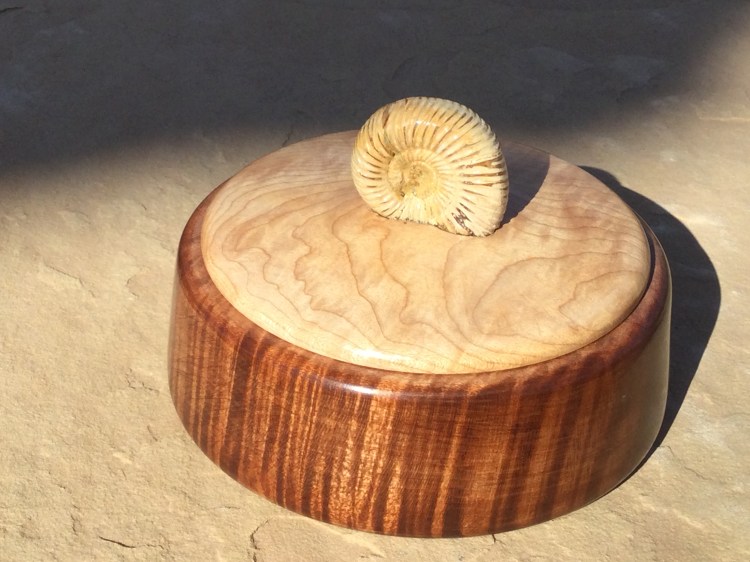 Lidded box. Figured red oak, curly maple, fossil amonite