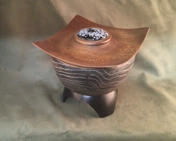 Japanese lantern box. Ebonized oak with silver fill, lacewood lid, ebonized maple base, snowflake obsidian.