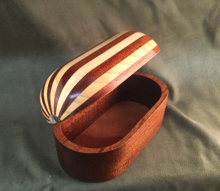 Box inspired by pot-bellied mandolin. Mahogany, maple, abalone inlay