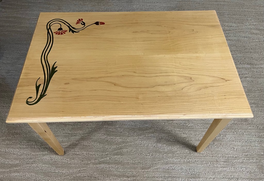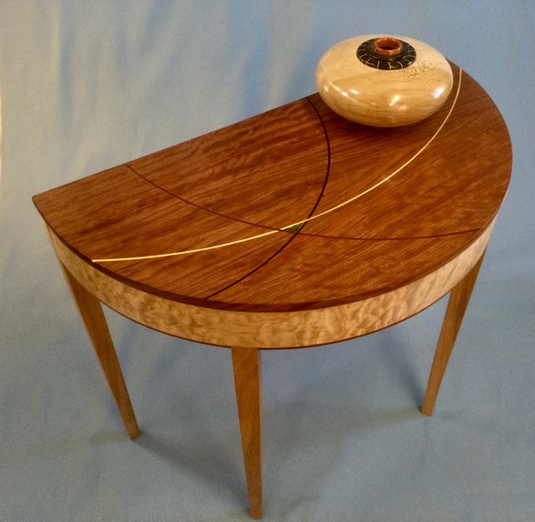 Demilune table with inlay. Bubinga, quilted maple, hickory, yellow heart, wenge, bloodwood, paua shell.