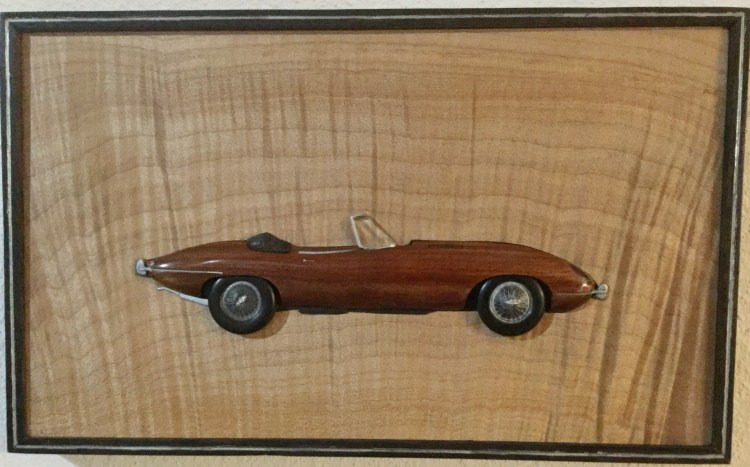 Bas-relief model of 1963 Jaguar E type roadster., Bloodwood, ebony, acrylic, figured maple.