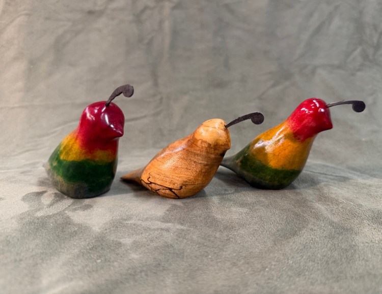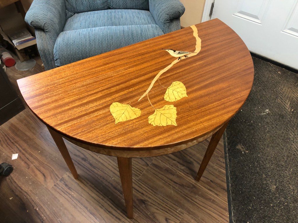:Demilune table with inlay. White-breasted Nuthatch on cottonwood branch with leaves. Mahogany, quilted maple, hickory, birdseye maple, holly, ebony, yellow-heart